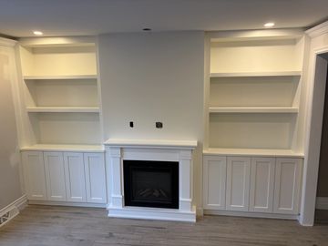Built-in sur mesure avec tablette intégrée à la structure en MDF. Collaboration avec SVC construction